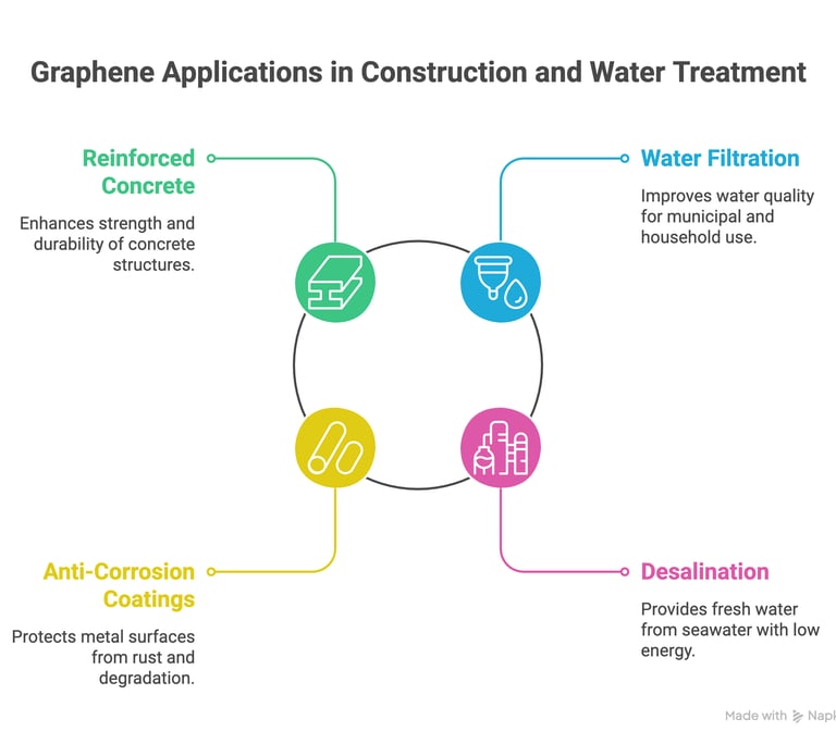 Cement production accounts for ~8% of global CO₂ emissions. Graphene-reinforced concrete requiring less cement directly reduces this footprint. In water treatment, graphene membranes use significantly less energy than thermal desalination and conventional filtration, easing pressure on water-stressed regions. Graphene coatings also extend the life of marine and coastal infrastructure, reducing demolition waste and raw material consumption.
