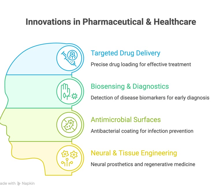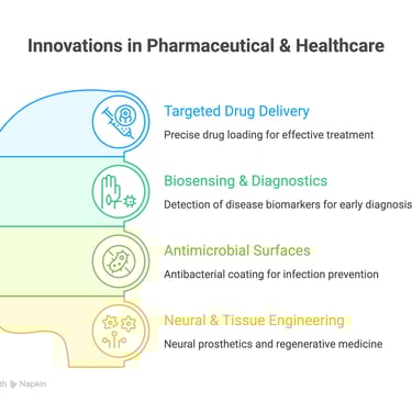 Graphene is redefining pharmaceutical science through its unmatched surface area, chemical versatility, and nanoscale precision. As a drug carrier, graphene oxide enables targeted delivery of therapeutic molecules directly to disease sites — minimising systemic toxicity. Its ability to conjugate with antibodies, peptides, and nucleic acids makes it an ideal scaffold for oncology, antiviral, and gene therapy applications.